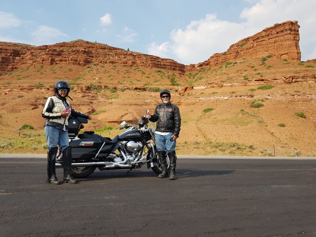 At one of the photo spots we met Ed and Rita from Arizona who are riding around in their Harley Davidson. Ed showed me his pistol in the side bag which is for ‘protection’.